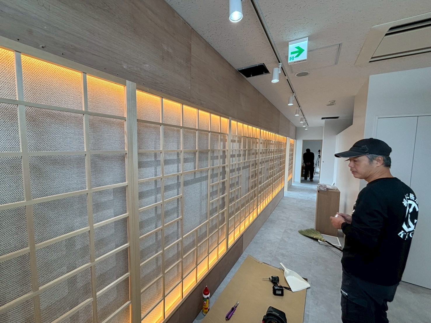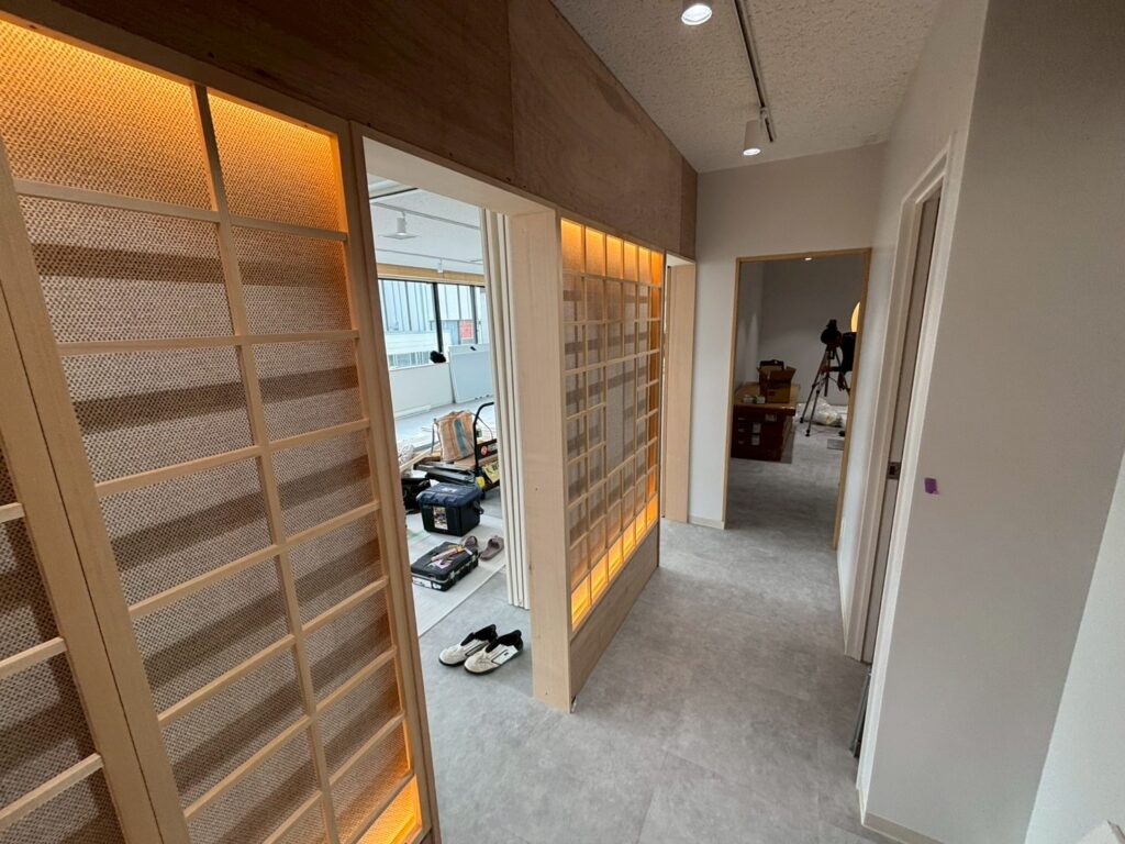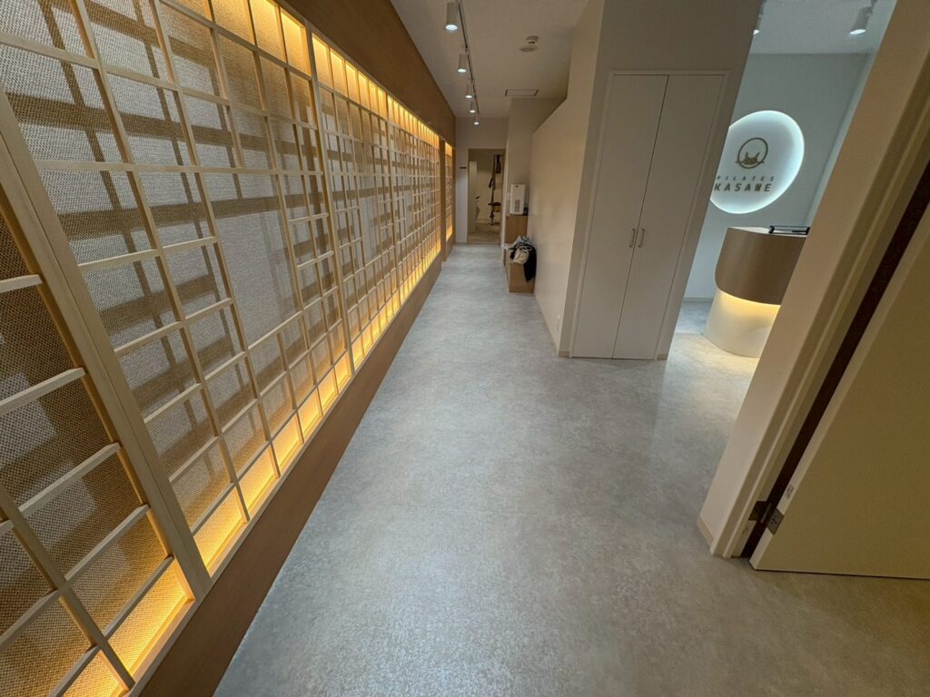 スタジオスペース、和風間仕切り、更衣室、受付スペース、間接照明の設置、スタジオロゴの制作他